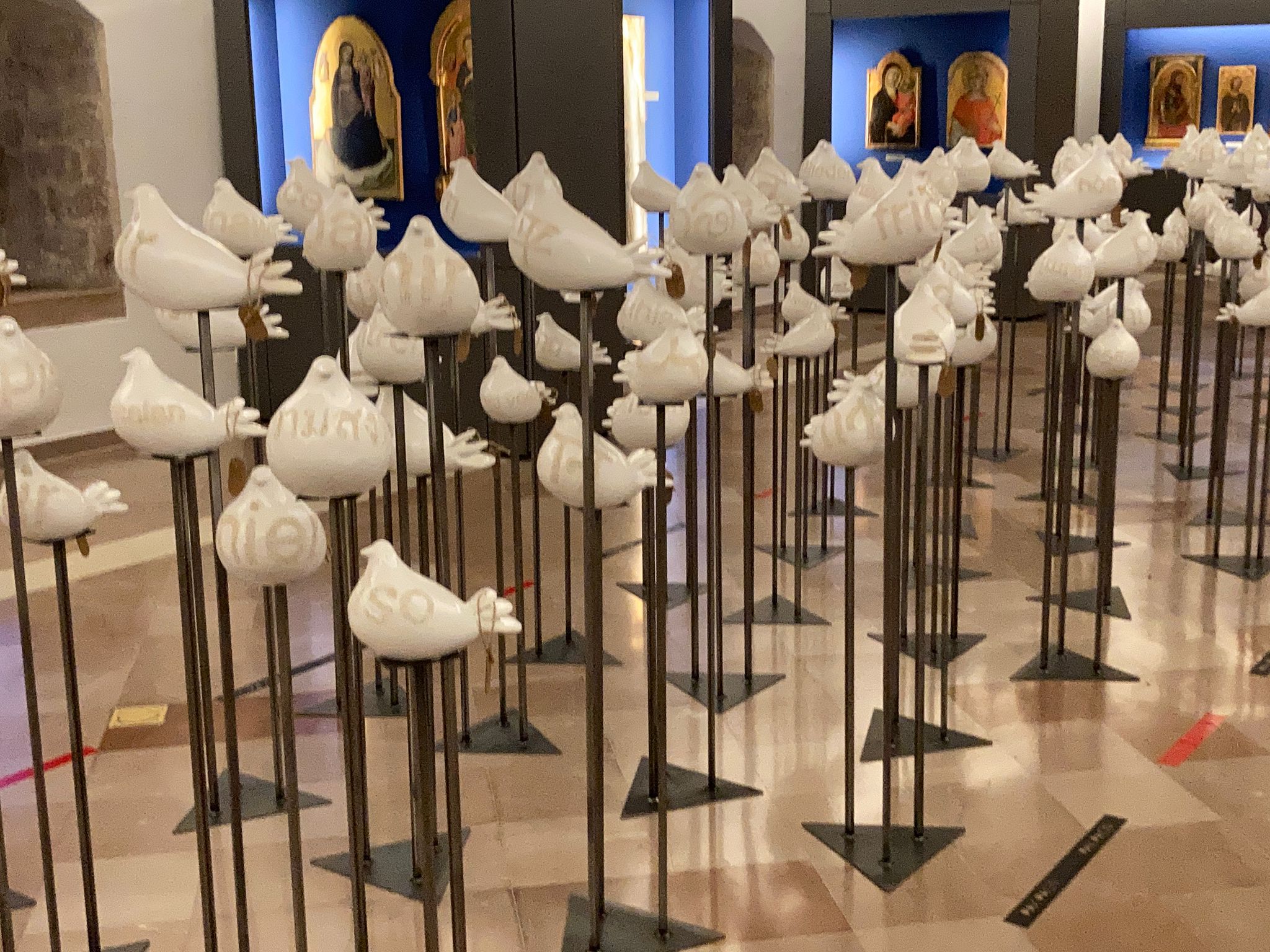 L’installazione, composta da 132 colombe in ceramica, ha offerto un sentiero immersivo e meditativo. Su ogni colomba era incisa la parola "pace" in una lingua diversa, simbolo potente della convivenza tra i popoli e del valore universale del dialogo. Un'opera che si è inserita con naturalezza nella tradizione francescana, trasformando lo spazio in un luogo di silenzio, ascolto e contemplazione.